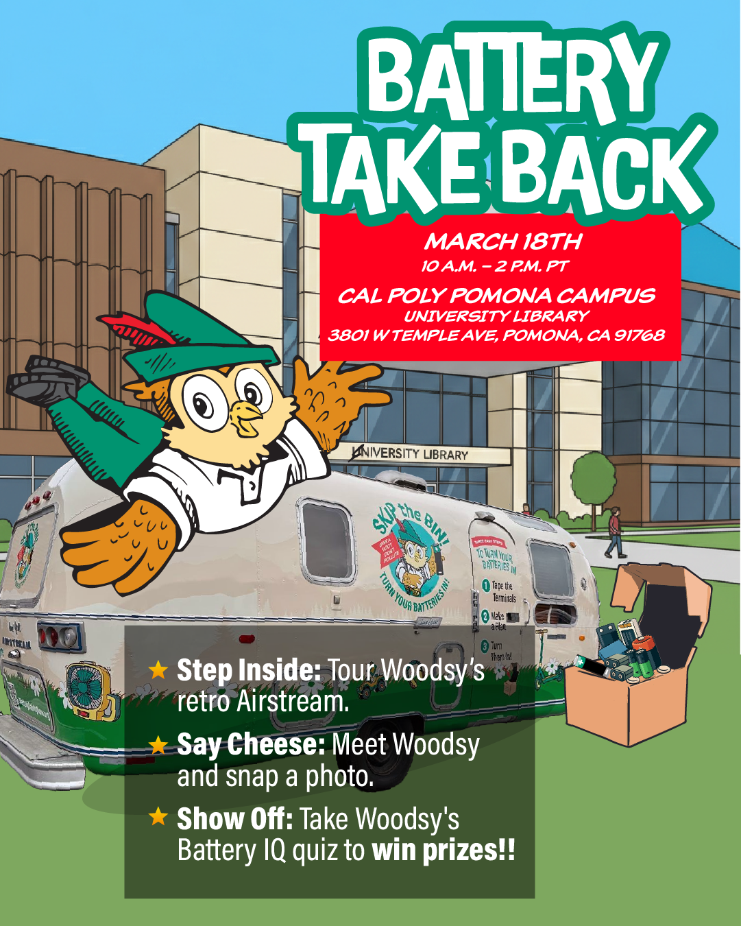 Tour Woodsy Owl’s retro Airstream, and see if you can win his battery challenge