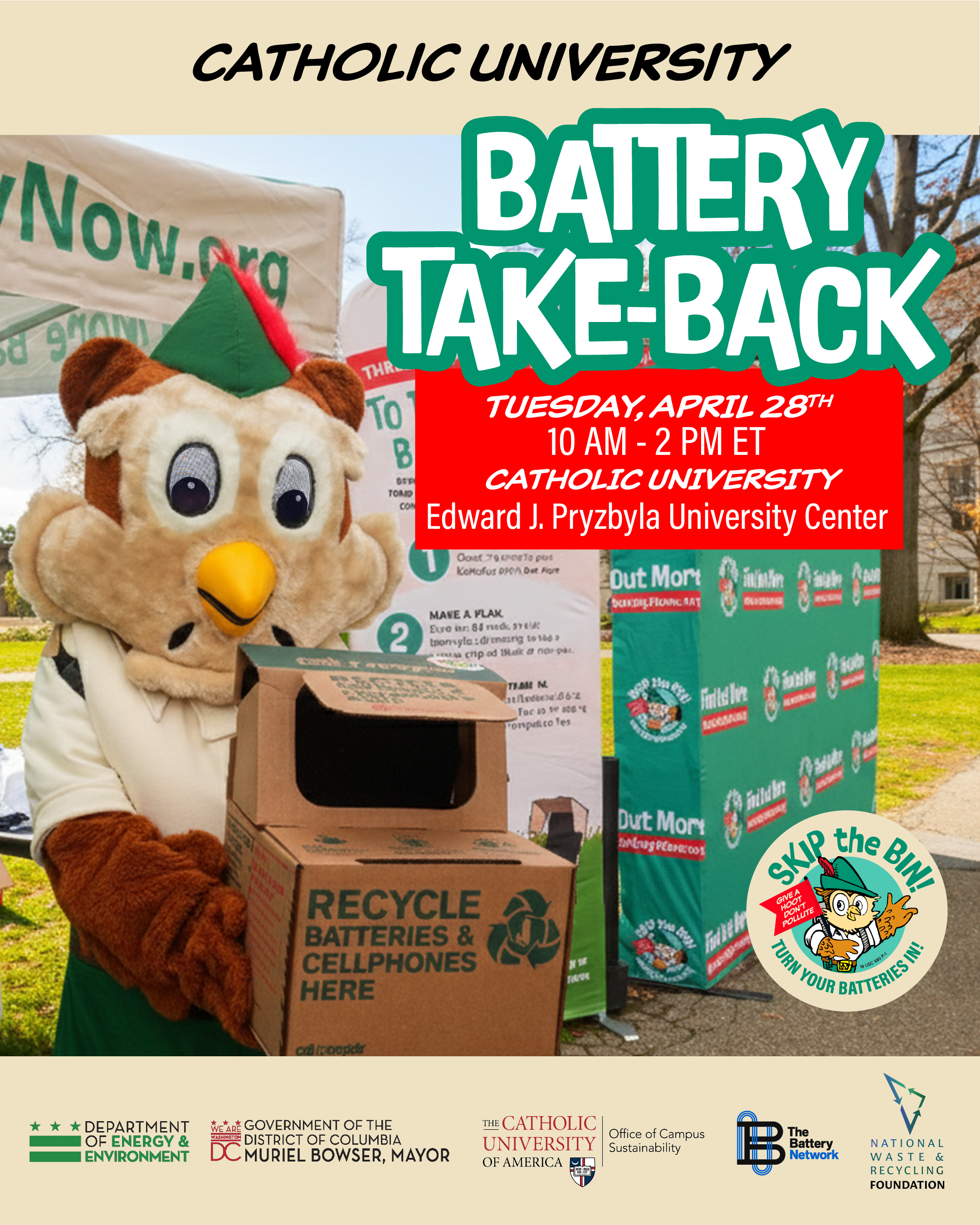 Join us in Washington, DC, at Catholic University, for a free battery take-back event with Woodsy Owl! Bring the whole family to learn about battery safety, proper disposal, and the simple steps you can take to keep your community safe from battery fires.