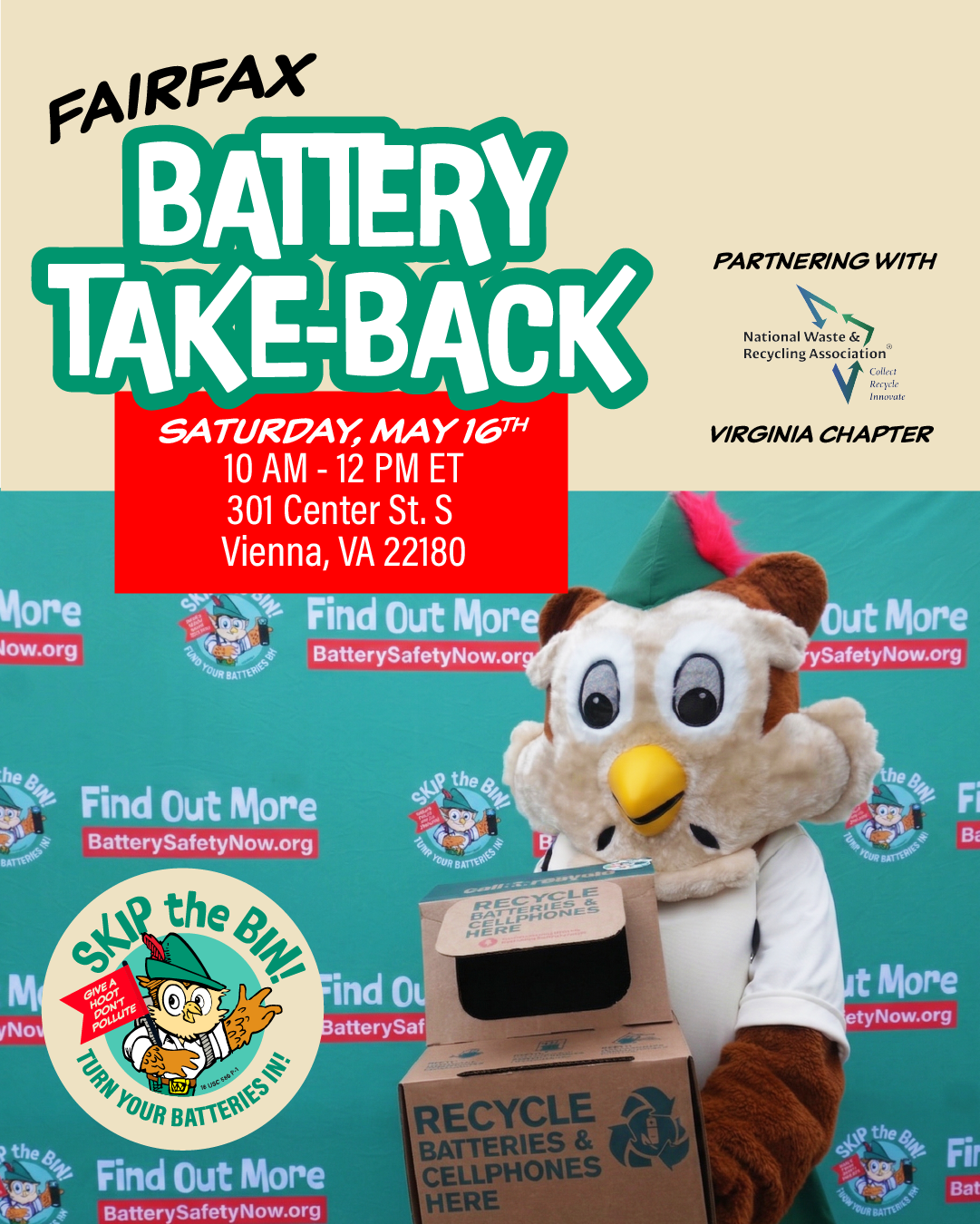 Join us in Fairfax, VA for a free battery take-back event with the NWRA Virginia Chapter and Woodsy Owl! Bring the whole family to learn about battery safety, proper disposal, and the simple steps you can take to keep your community safe from battery fires.