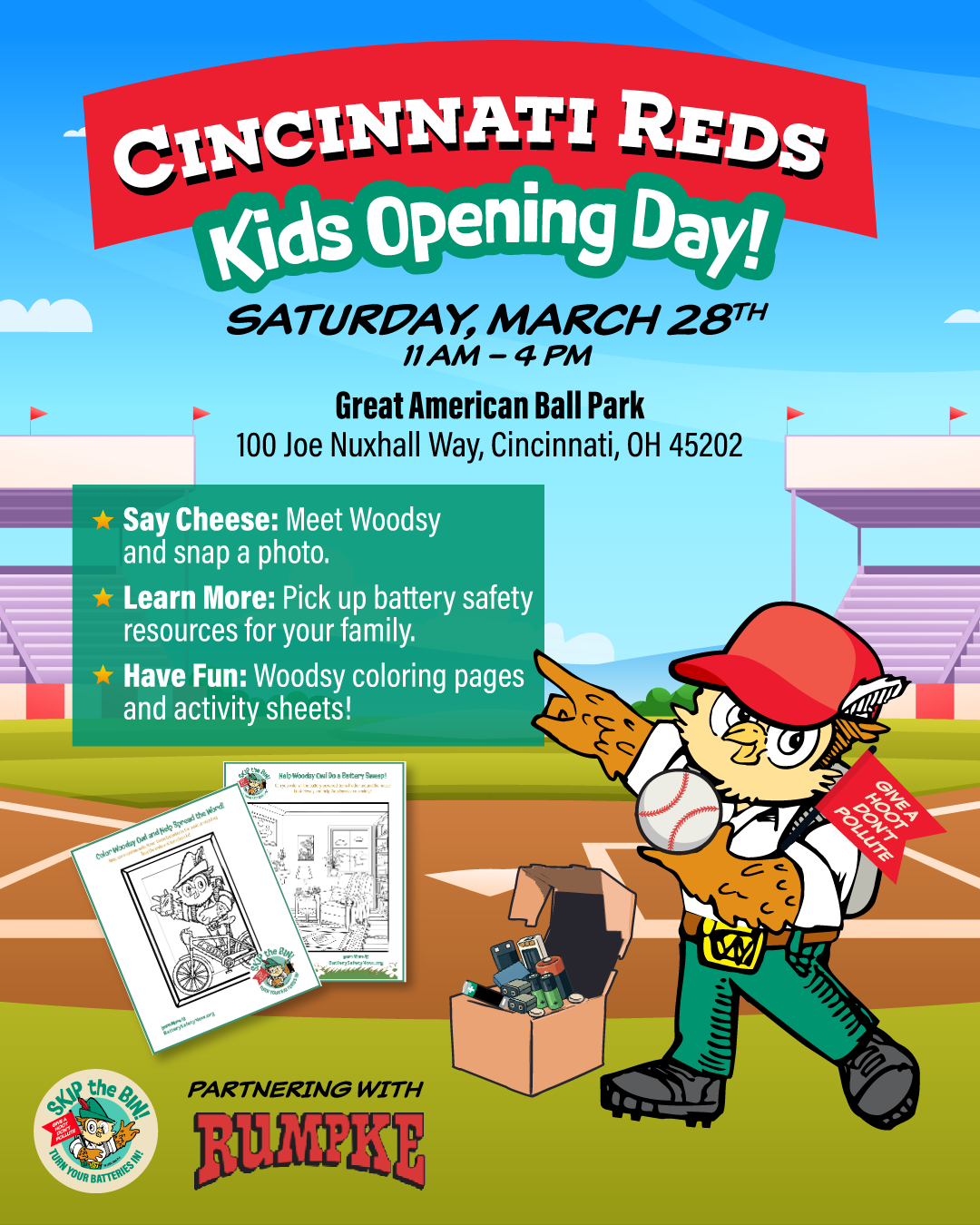Woodsy Owl is headed to Kids Opening Day for a family-friendly battery safety stop at the ballpark. Catch Woodsy in the mascot parade, then find him in the Fan Zone for photos, kids activities, giveaways, and simple tips families can use to keep batteries out of the trash and recycling.