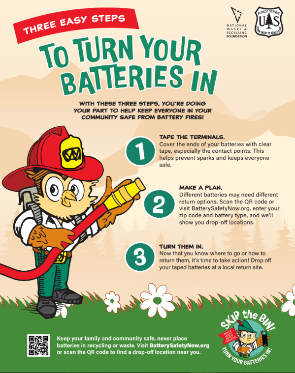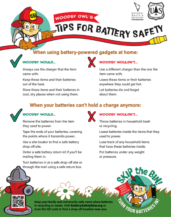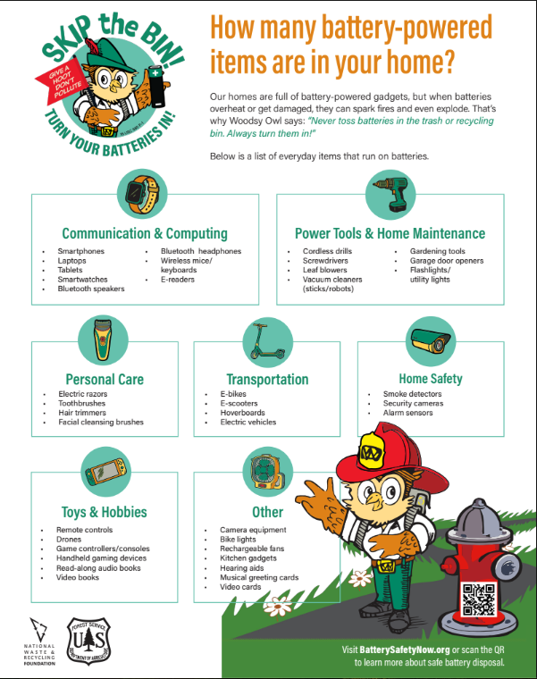 Knowledge is power! Use these resources to educate friends, family, loved ones, and yourself about battery safety. RESOURCES Learn how to turn your batteries in, with three easy steps. Learn More Discover which everyday household items run on batteries. It’s more than you might think! Learn More Get Woodsy Owl’s Tips for Battery Safety. Learn More Campaign Overview Learn More